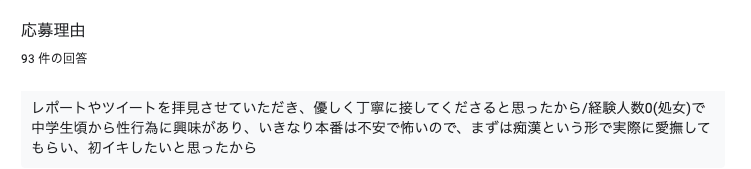 応募理由・経験人数のアンケート結果からも、処女の方は割と多いです(๑º﹃º๑)